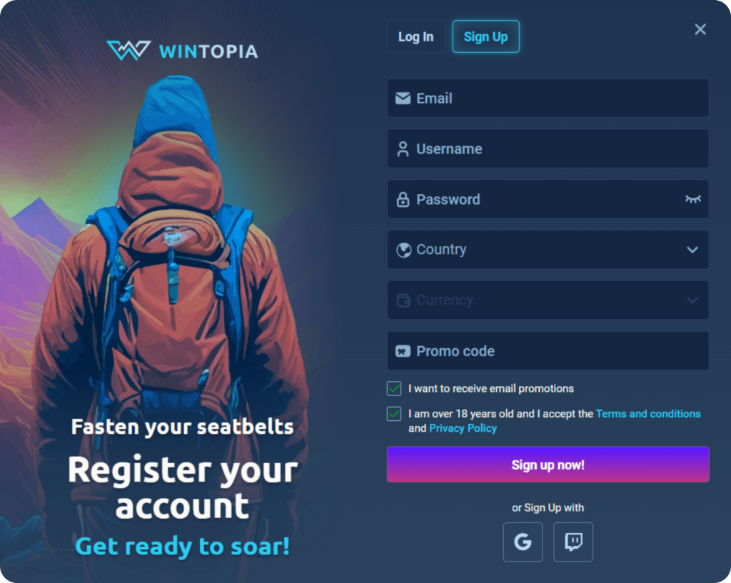 Go to wintopia.com, click Sign Up, fill in your details, and confirm your email.